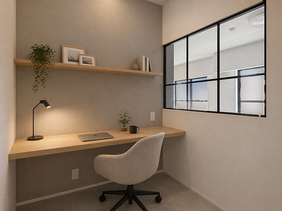 さらに、奥の壁面には壁掛けTVを設置できるよう計画しており、配線や機器類は裏側に隠せるため、空間をすっきりと見せる工夫も取り入れています。
